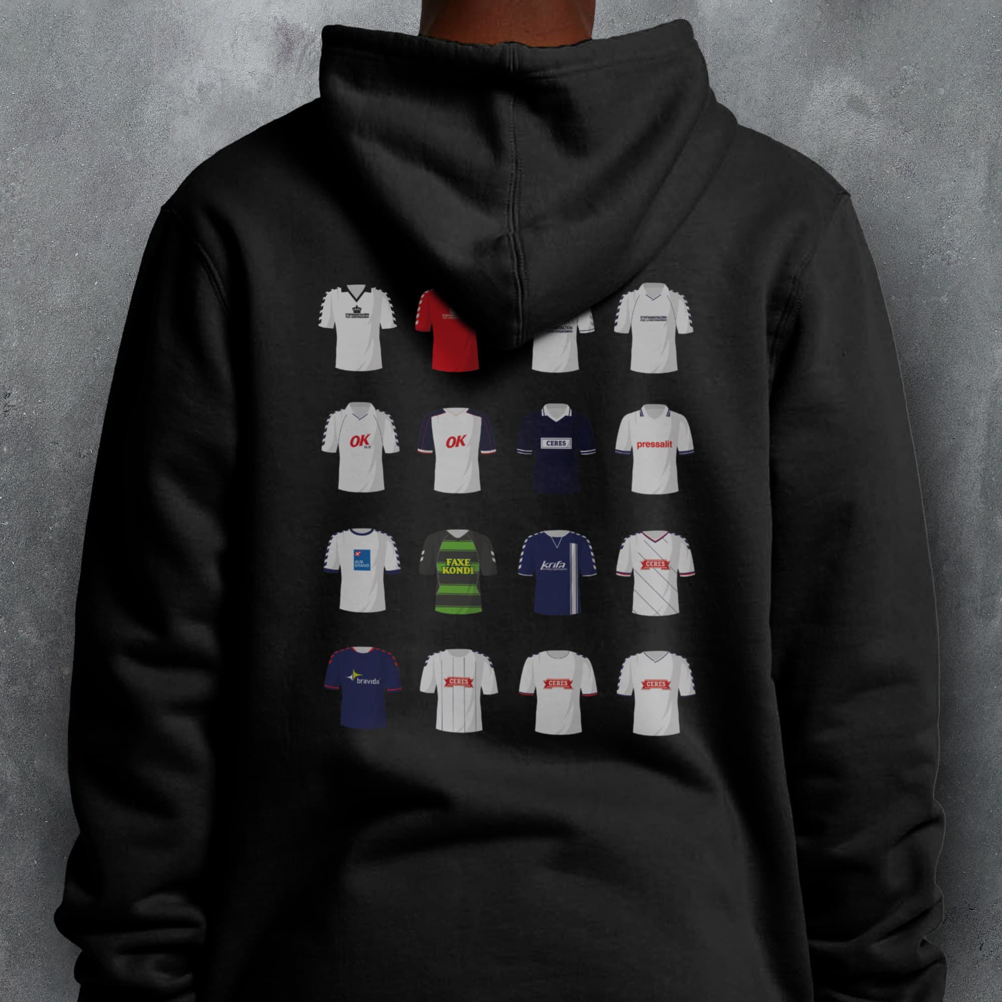 This hoodie showcases some of the most iconic kits that Aarhus Gymnastikforening players have worn throughout the history of the club. The strips range from the 1980's right up through to recent times and is perfect way to celebrate the heritage of the team either for yourself or as a special gift for any Aarhus Gymnastikforening fan.