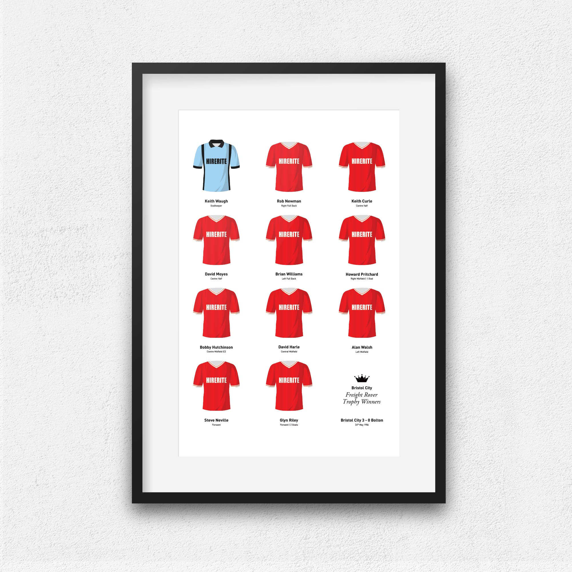 This print, featuring the Bristol City Freight Rover Trophy-winning team of 1986, is the perfect way to celebrate this historic achievement either for yourself or as a very special gift for any Bristol City fan.