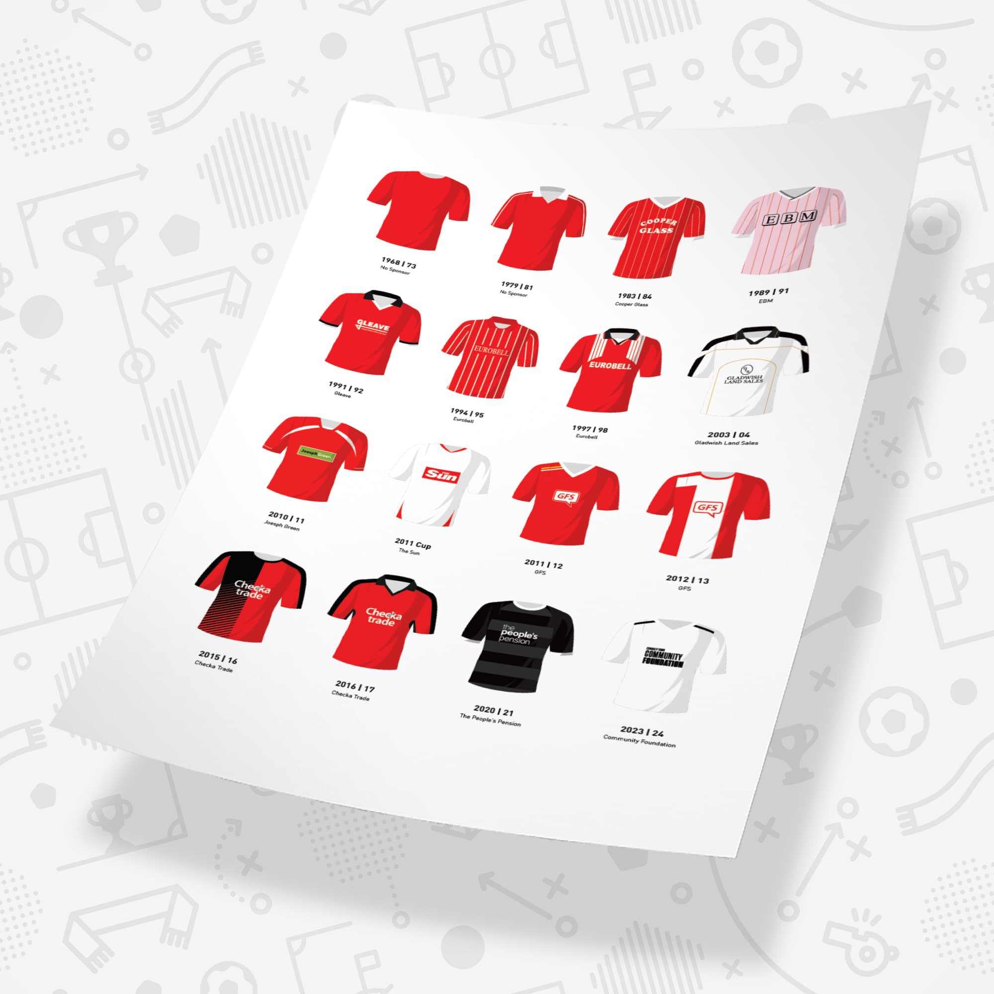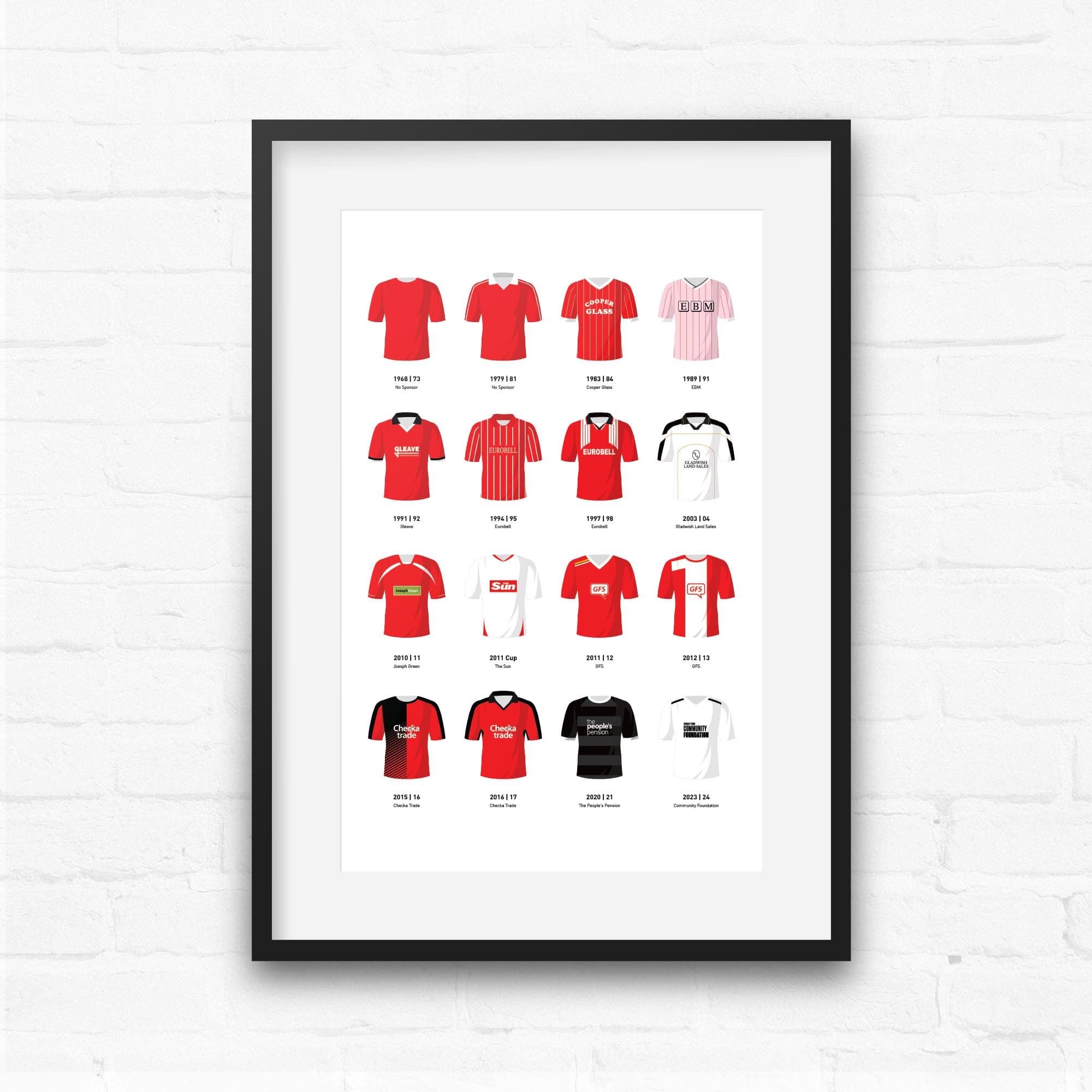 This print showcases some of the most iconic kits that Crawley players have worn throughout the history of the club. The strips range from the 1960's right up through to recent times and is the perfect way to celebrate the heritage of the team either for yourself or as a special gift for any Crawley fan.