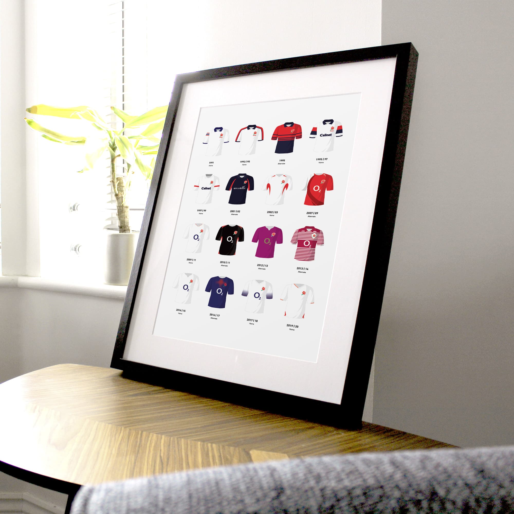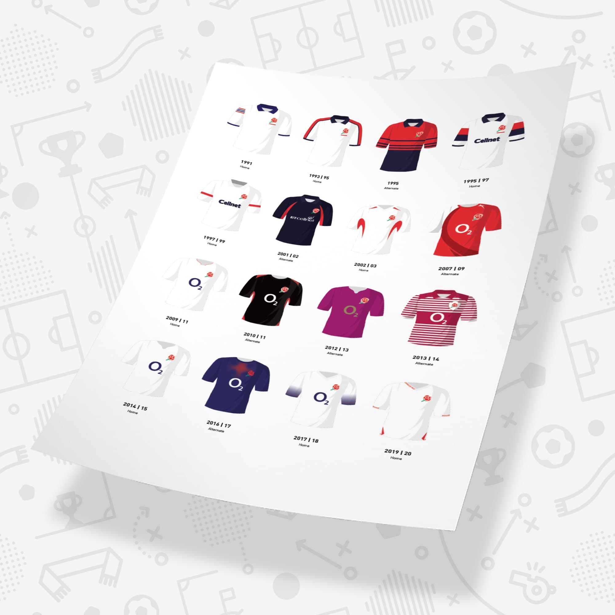 This print showcases some of the most iconic kits that England Rugby Union players have worn throughout the history of the national team. The strips range from the 1990's right up through to recent times and include the legendary jersey worn by the World Cup winning side of 2003. What a perfect way to celebrate the heritage of the team either for yourself or as a special gift for any England Rugby Union fan.