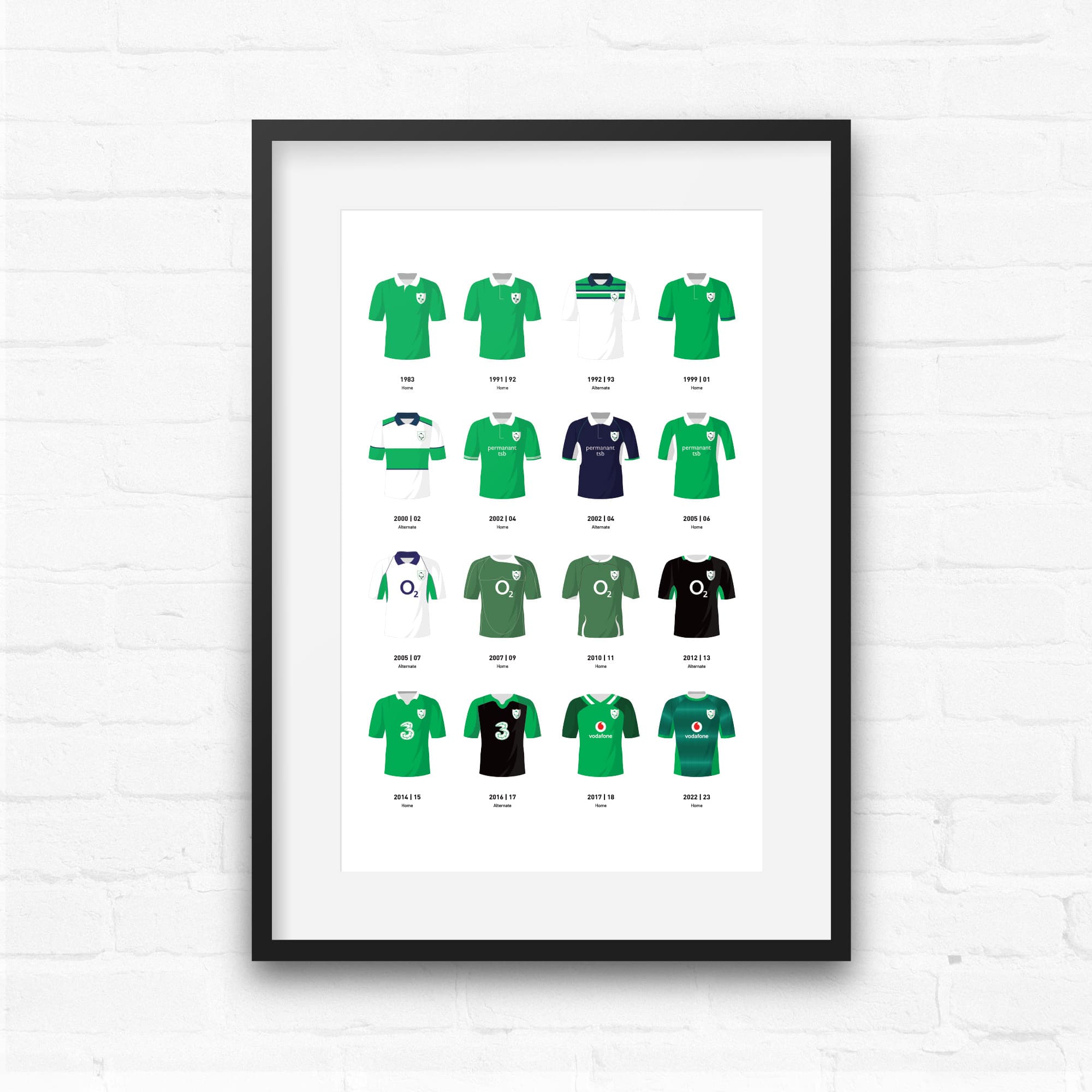 This print showcases some of the most iconic kits that Ireland Rugby Union players have worn throughout the history of the national team. The strips range from the 1980's right up through to recent times and include the legendary jersey worn by the Grand Slam winning sides of 2009, 2018 & 2023. What a perfect way to celebrate the heritage of the team either for yourself or as a special gift for any Ireland Rugby Union fan.