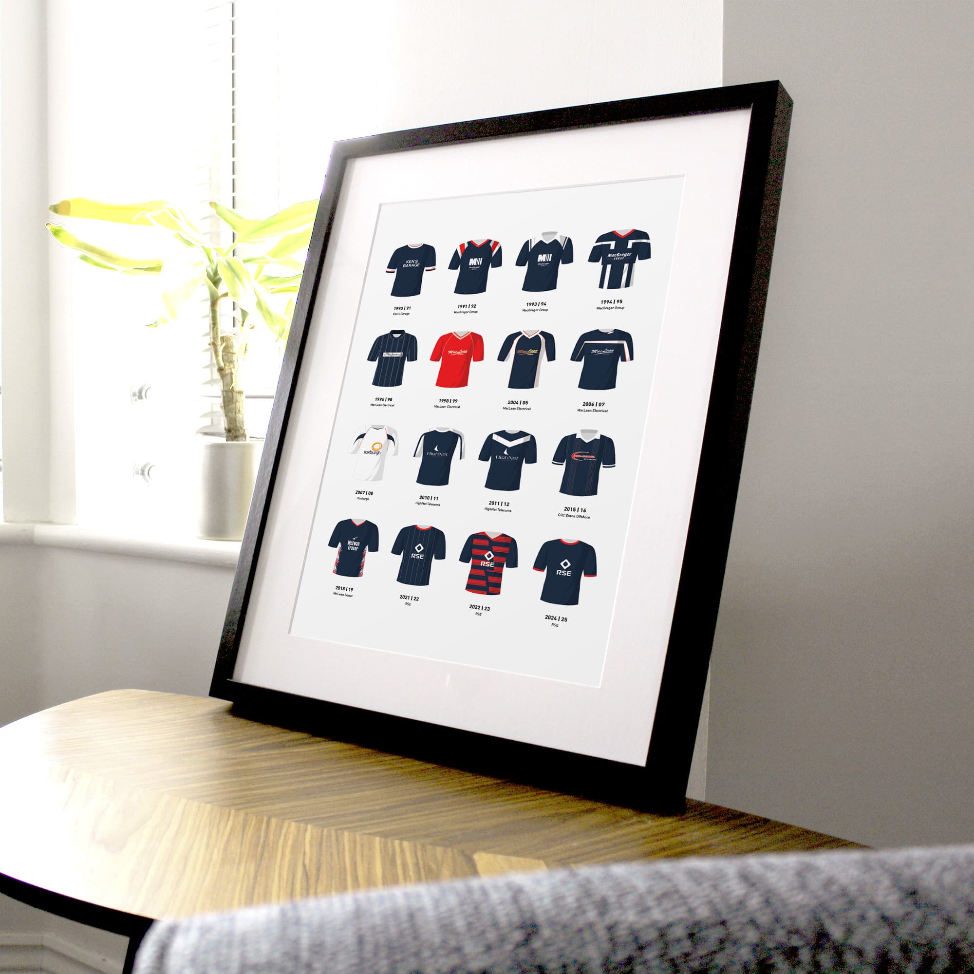 This print showcases some of the most iconic kits that Ross County players have worn throughout the history of the club. The strips range from the 1990's right up through to recent times and is the perfect way to celebrate the heritage of the team either for yourself or as a special gift for any Ross County fan.