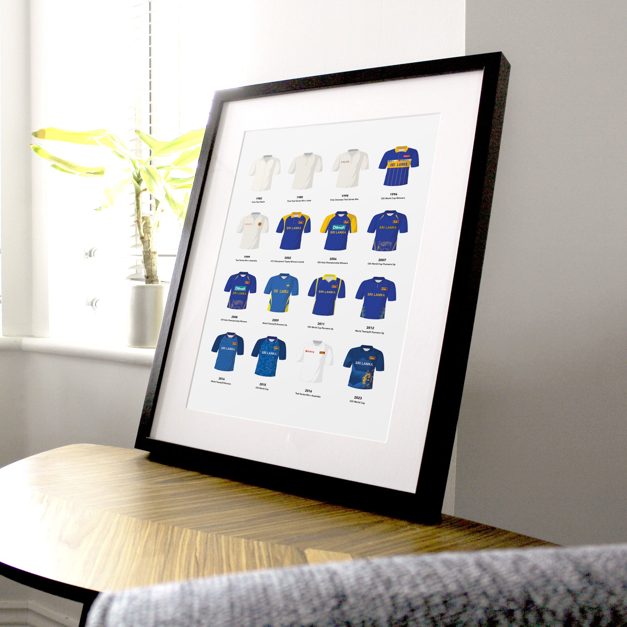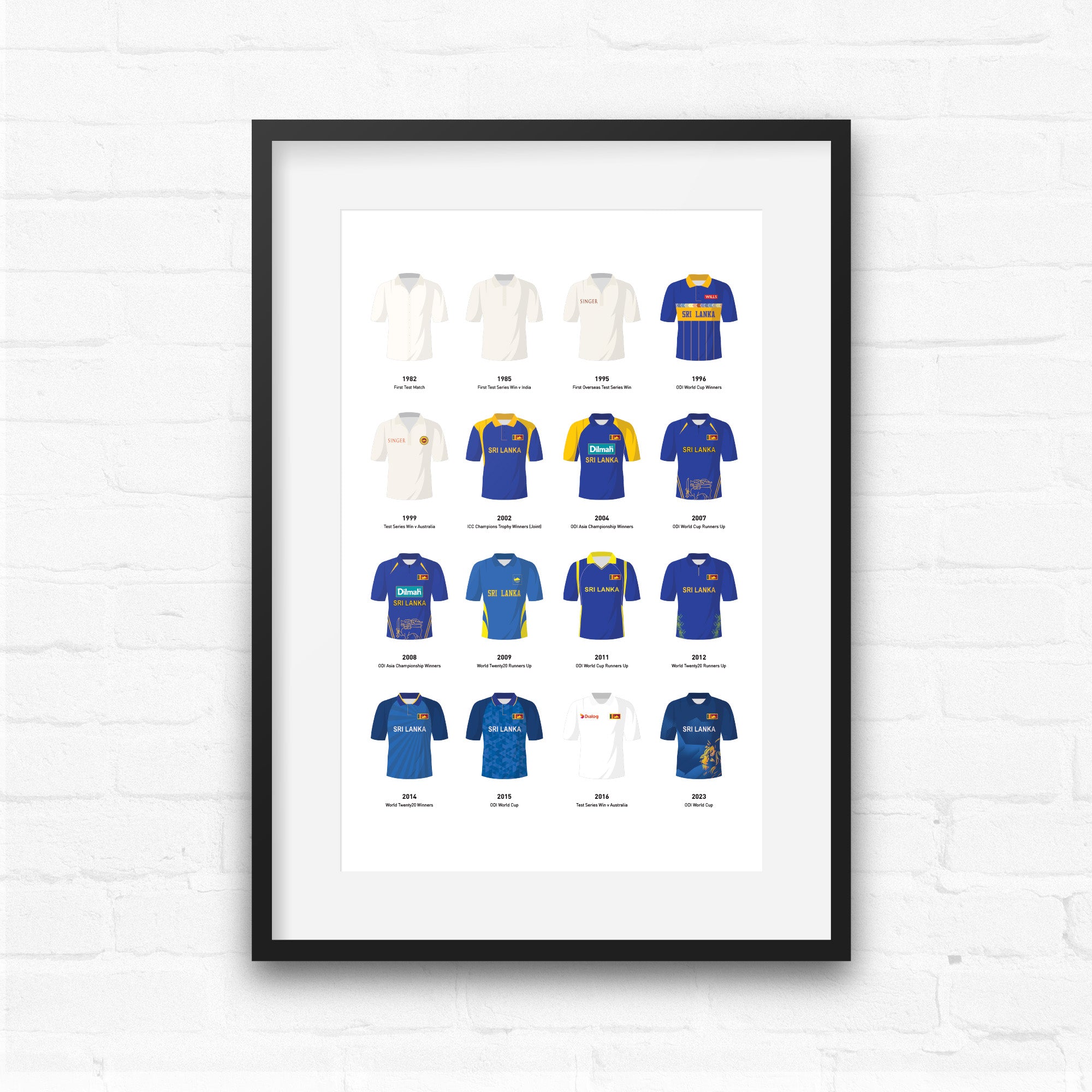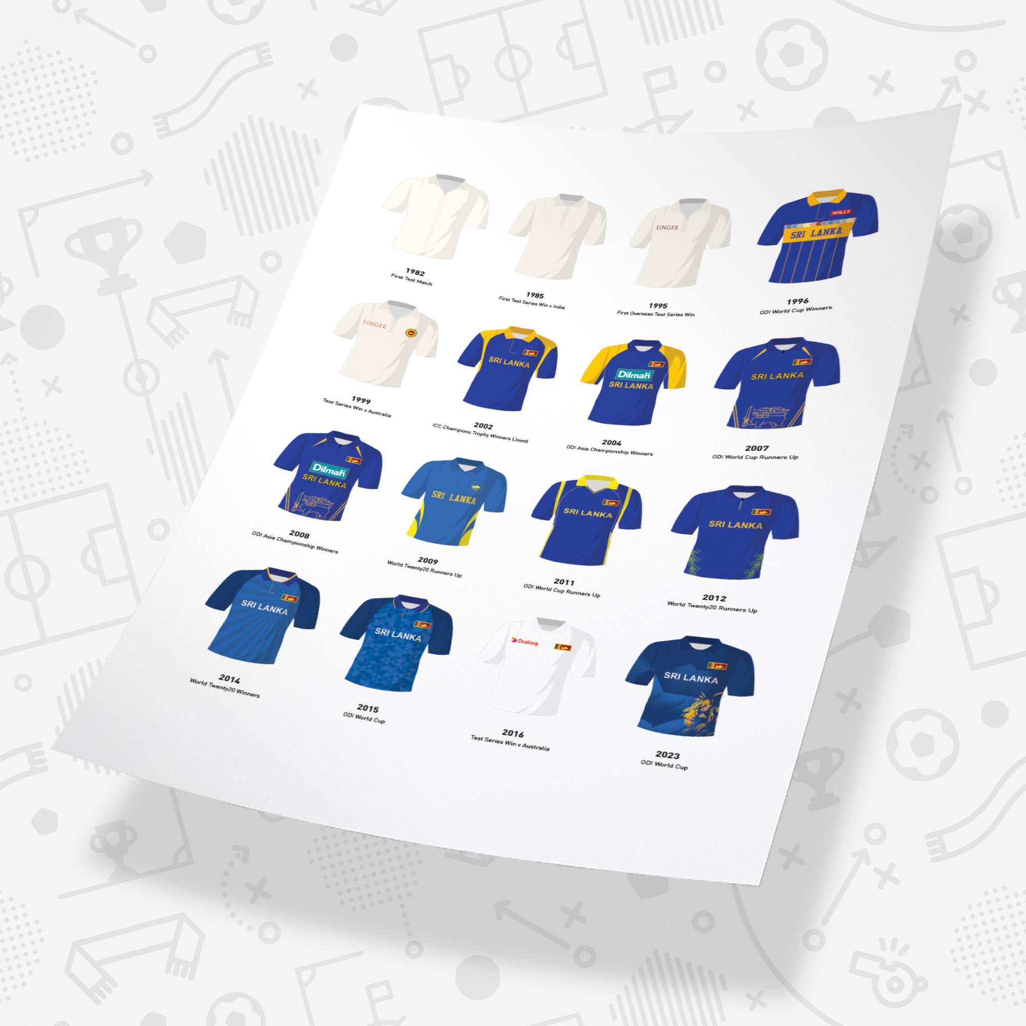 This print showcases some of the most iconic kits that Sri Lanka Cricket players have worn throughout the history of the national team. The strips range from the 1980's right up through to recent times and is the perfect way to celebrate the heritage of the team either for yourself or as a special gift for any Sri Lankan Cricket fan.