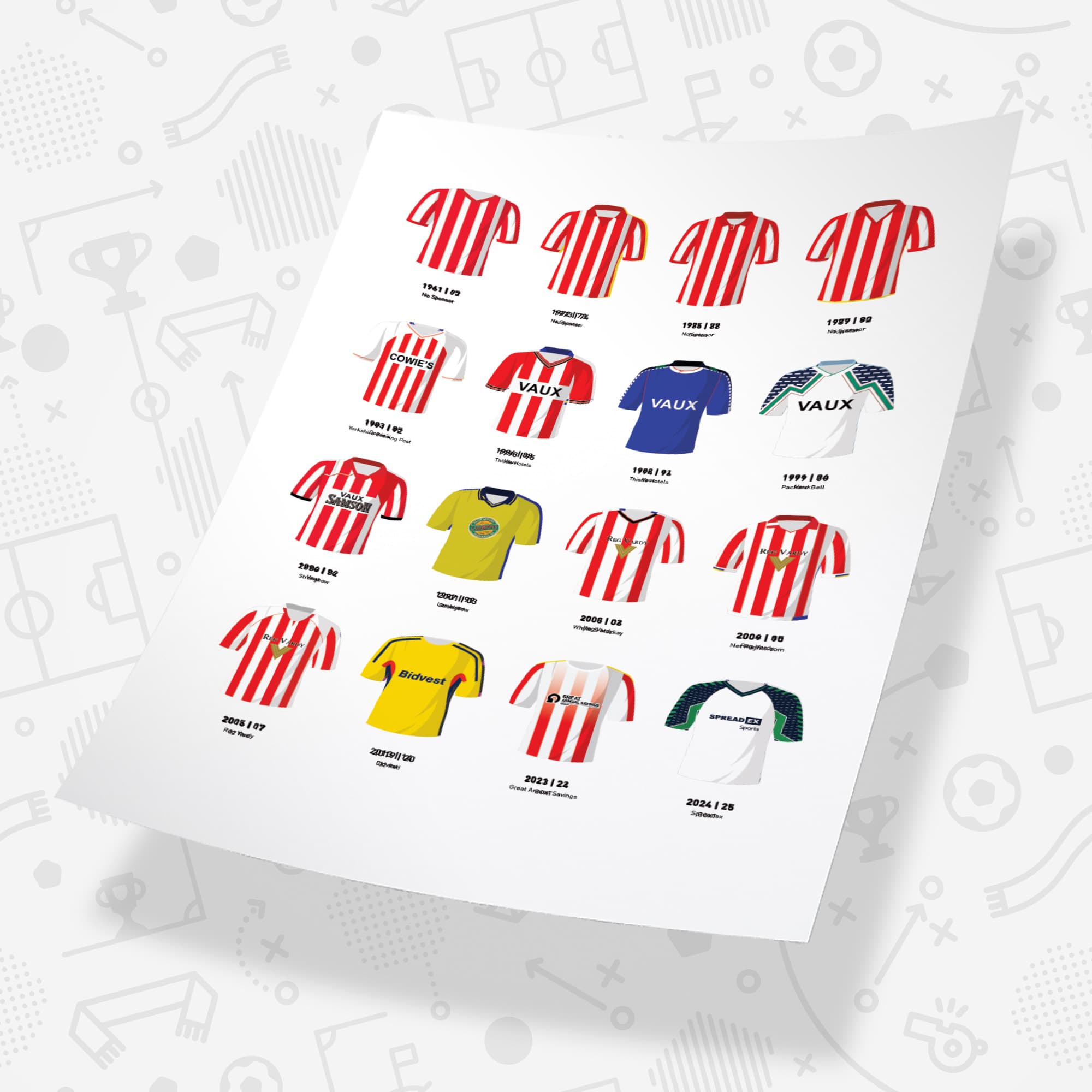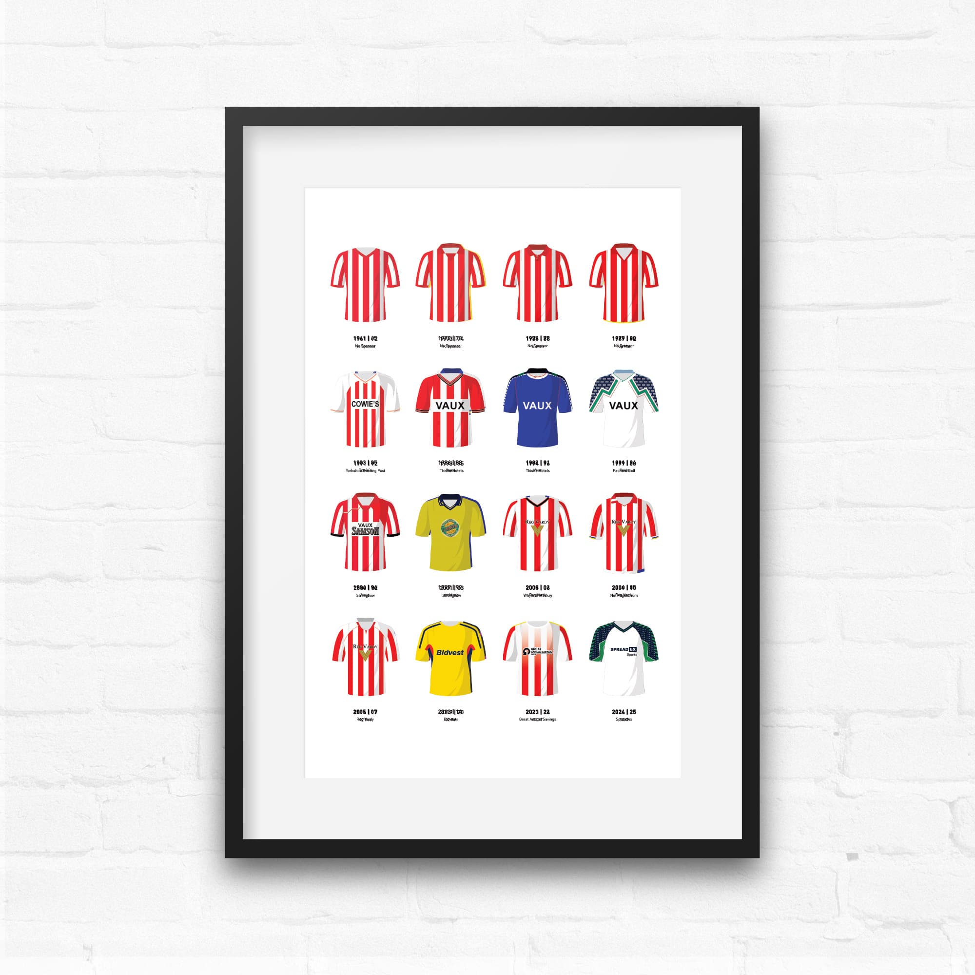 This print showcases some of the most iconic kits that Sunderland players have worn throughout the history of the club. The strips range from the 1960's right up through to recent times and include the legendary shirt worn in the 1973 FA Cup winning season. What a perfect way to celebrate the heritage of the team either for yourself or as a special gift for any Sunderland fan.